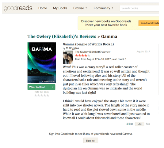 A rousing dystopian science fiction epic, Gamma is the debut release from M. Susanne Wiggins and it’s enormously readable. Look to the broader realms of the genre when reading it and you’d be hard-pressed to deny some of the more notable influences that have inspired her musings but rest assured she isn’t out to dull the masses with literary opium. Creating a powerful visual sense of time and place which quickly ensnares our curiosity it might be a long read but Wiggins makes it well worth surrendering to her imagination. Far too often authors of dystopian fiction fall back on arty, pretentious psychobabble to detract readers from wafer-thin plots but Wiggins pitches it just right with refreshingly uncompromising prose and a meticulous eye for detail whilst maintaining an equitable balance between action and intrigue. On this level, she does what the best science fiction writers do and goes beyond the lure of her lead protagonist to use the future as a way to critiquing the present and it’s here her writing really comes into its own.With a host of powerful auxiliary characters that are hard to forget Wiggins has delivered a corker of a debut and one which bodes well for future releases in her ‘League of Worlds’ series. It is highly recommended.